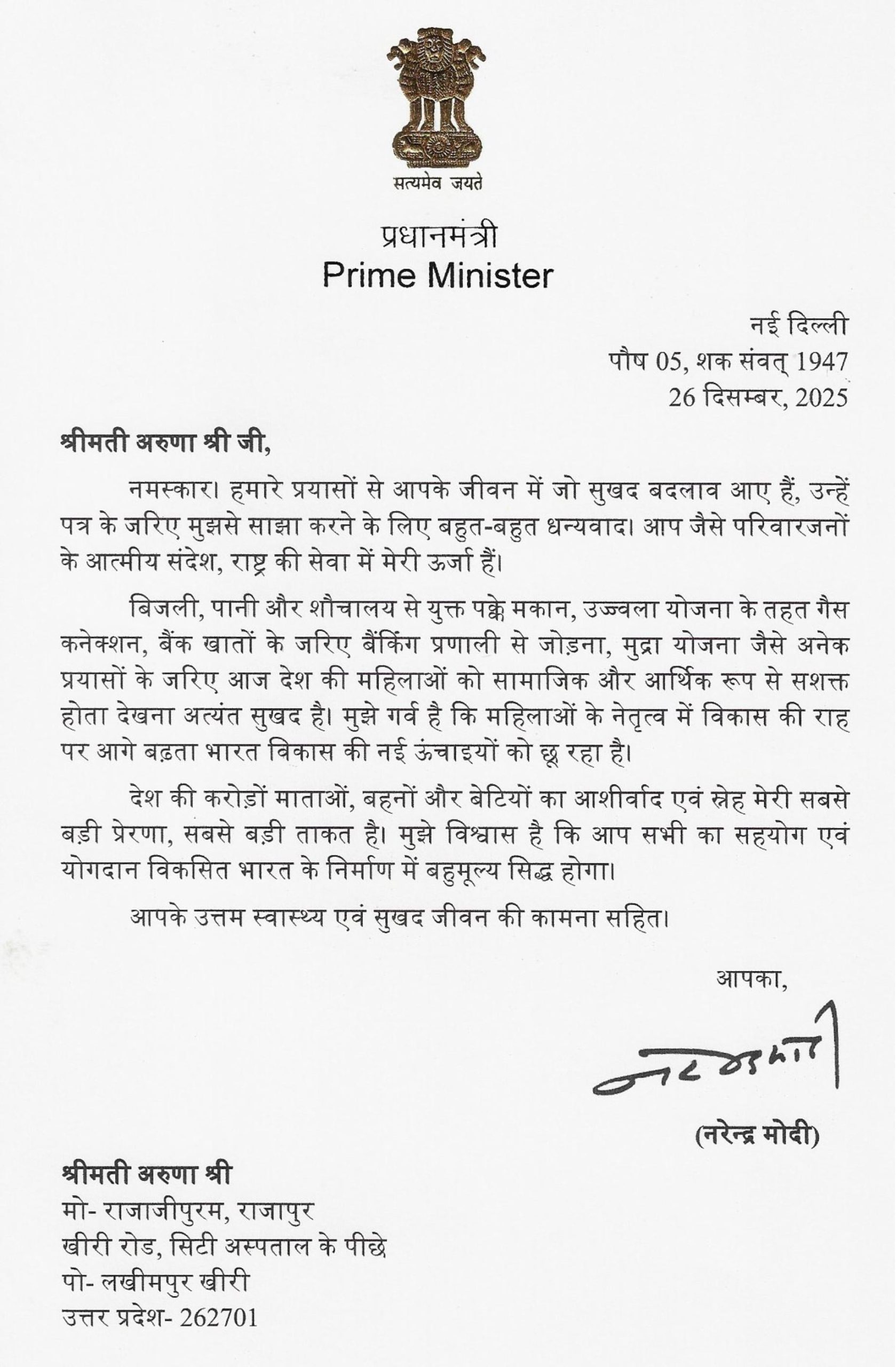 अपने पत्र में अरुणा श्री ने उत्तर प्रदेश में डबल इंजन सरकार की अन्य पहलों की भी तारीफ की. उन्होंने बताया कि इन योजनाओं का असर केवल कागजों तक सीमित नहीं है, बल्कि जमीन पर साफ तौर पर दिखाई देता है. उज्ज्वला योजना के साथ-साथ बिजली, पानी और अन्य बुनियादी सुविधाओं की उपलब्धता ने उनके परिवार की जीवनशैली को बेहतर बनाया है.